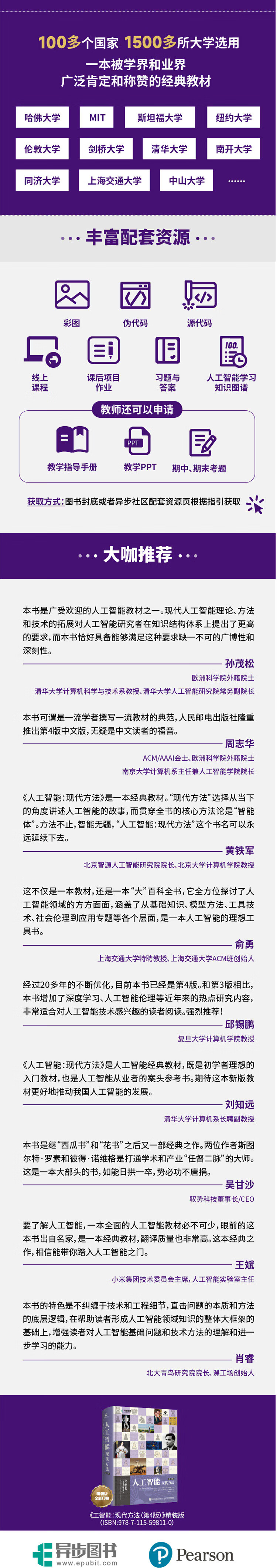 本书可谓是集优秀学者撰写优秀教材,作者是国际人工智能领域专家、ACM/AAAI会士、曾获IJCAI卓越研究奖、AAAI费根鲍姆奖、AAAI/EAAI杰出教育家奖、ACM杰出教育家奖等荣誉,自1995年第1版出版以来已被全球大约1500所大学用作人工智能入门教科书。人民邮电出版社隆重推出第4版中文版,无疑是中文读者的福音。